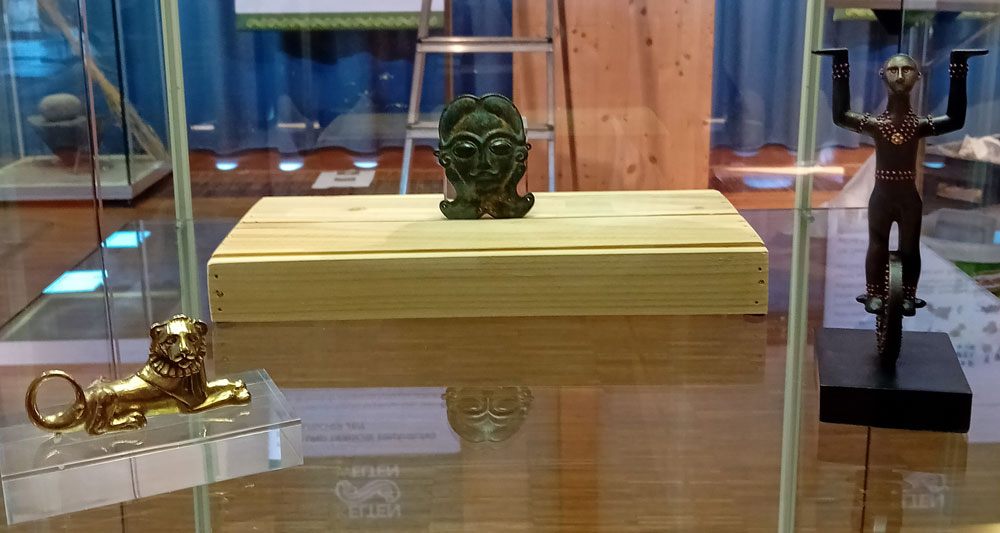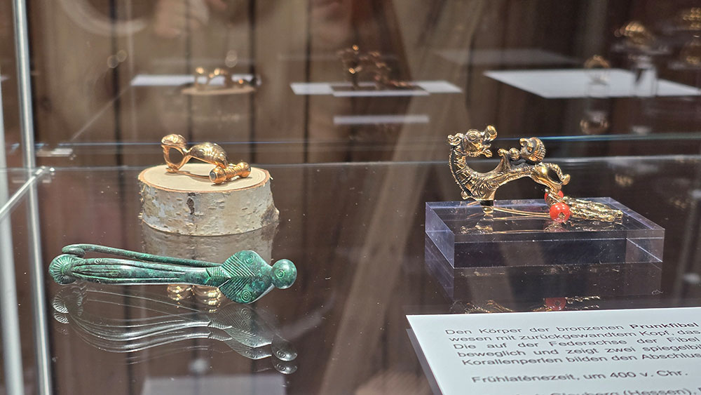 Die Repliken, hier eine Fabelwesen-Menschenkopf-Fibel vom Glauberg, erstrahlen in goldenem Glanz, wie die bronzenen Originale das in der keltischen Zeit auch taten, bevor sie ihre heutige Patina erhielten.
